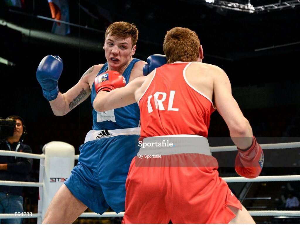 21 October 2013; Aston Brown, left, Scotland, exchanges punches with Jason Quigley, Finn Valley BC, Donegal, representing Ireland, during their Men's Middleweight 75Kg Last 16 bout. AIBA World Boxing Championships Almaty 2013, Almaty, Kazakhstan. Photo by Sportsfile