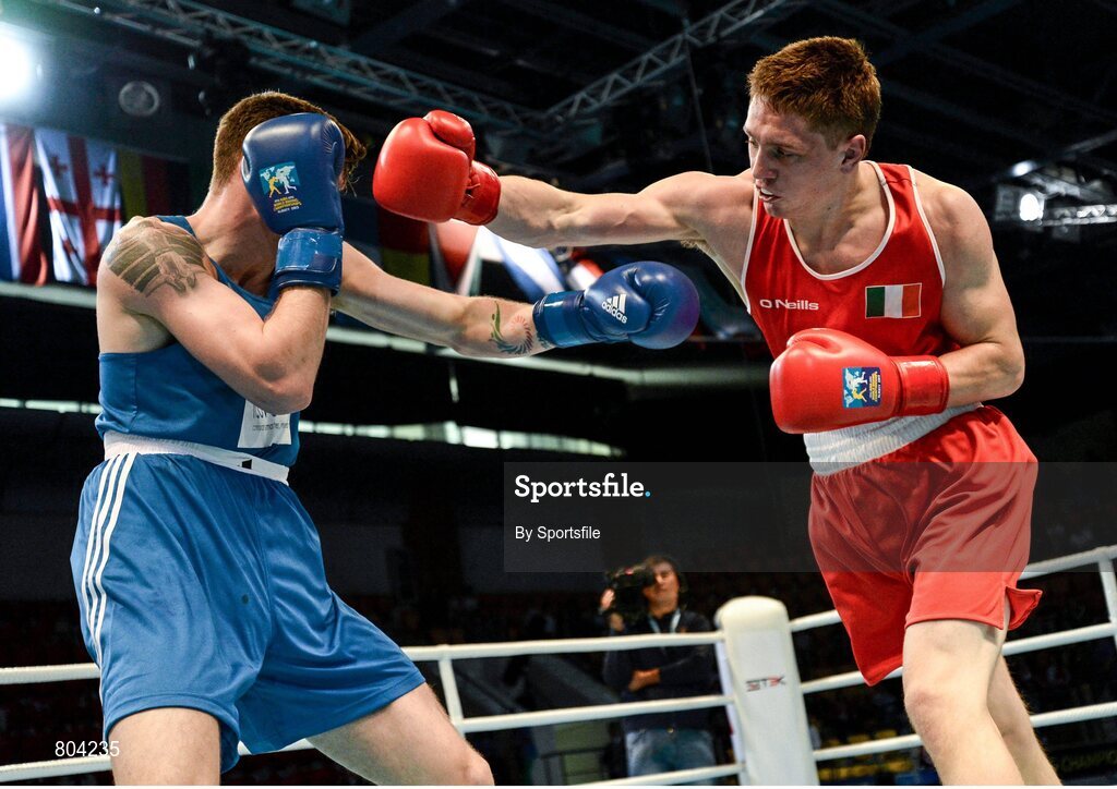 21 October 2013; Jason Quigley, right, Finn Valley BC, Donegal, representing Ireland, exchanges punches with Aston Brown, Scotland, during their Men's Middleweight 75Kg Last 16 bout. AIBA World Boxing Championships Almaty 2013, Almaty, Kazakhstan. Photo by Sportsfile