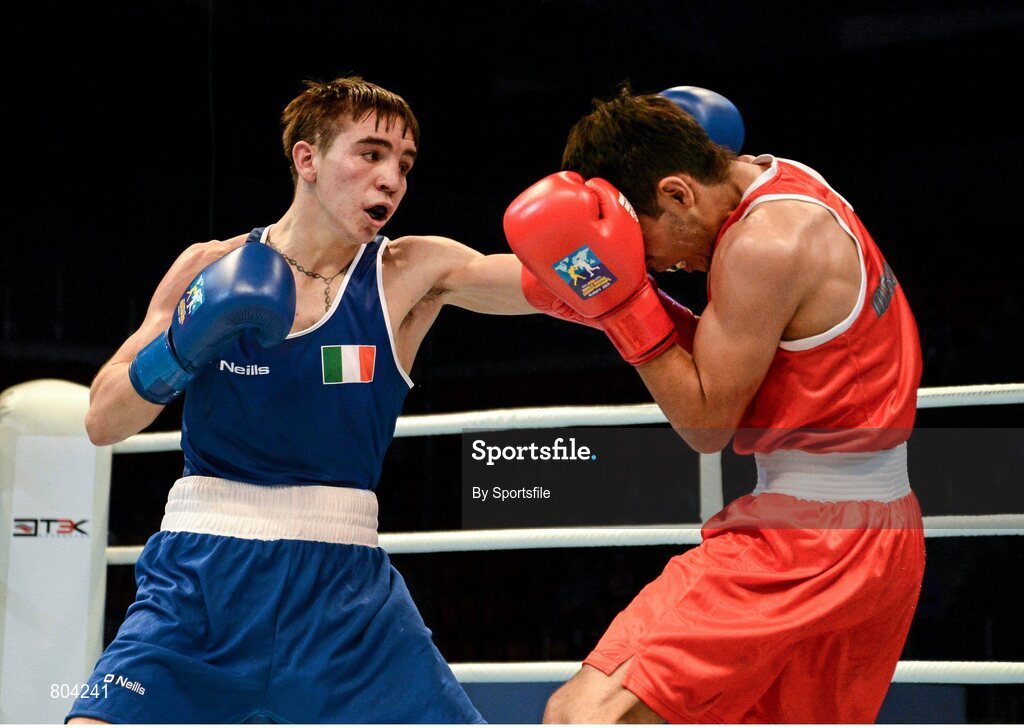 21 October 2013; Michael Conlan, left, St. John Bosco BC, Belfast, representing Ireland, exchanges punches with Brian Gonzalez, Mexico, during their Men's Bantamweight 56Kg Last 16 bout. AIBA World Boxing Championships Almaty 2013, Almaty, Kazakhstan. Photo by Sportsfile