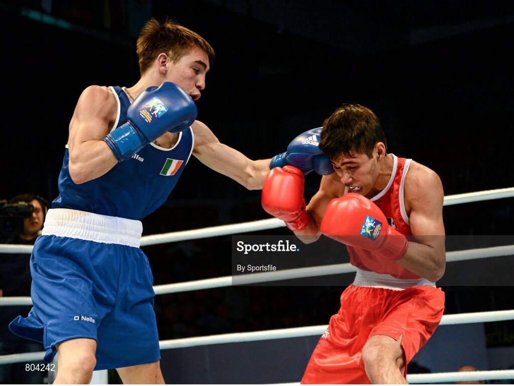 21 October 2013; Michael Conlan, left, St. John Bosco BC, Belfast, representing Ireland, exchanges punches with Brian Gonzalez, Mexico, during their Men's Bantamweight 56Kg Last 16 bout. AIBA World Boxing Championships Almaty 2013, Almaty, Kazakhstan. Photo by Sportsfile
