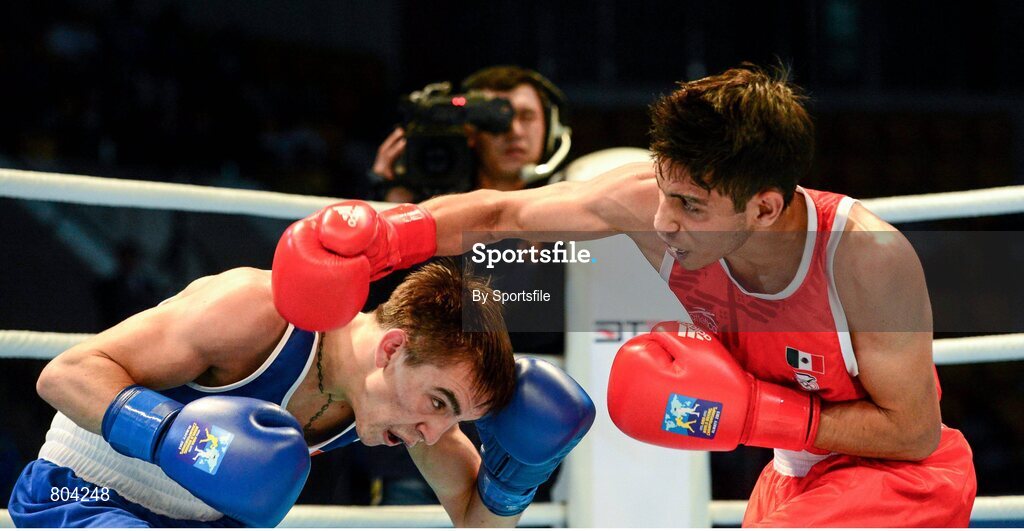 21 October 2013; Brian Gonzalez, right, Mexico, exchanges punches with Michael Conlan, St. John Bosco BC, Belfast, representing Ireland, during their Men's Bantamweight 56Kg Last 16 bout. AIBA World Boxing Championships Almaty 2013, Almaty, Kazakhstan. Photo by Sportsfile