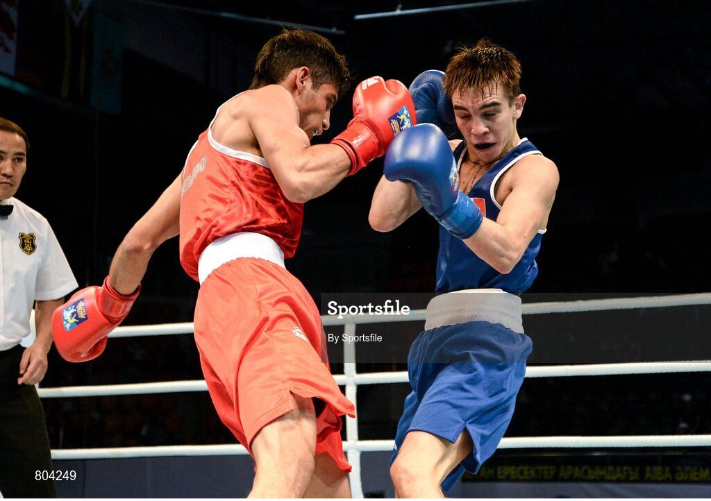 21 October 2013; Brian Gonzalez, left, Mexico, exchanges punches with Michael Conlan, St. John Bosco BC, Belfast, representing Ireland, during their Men's Bantamweight 56Kg Last 16 bout. AIBA World Boxing Championships Almaty 2013, Almaty, Kazakhstan. Photo by Sportsfile