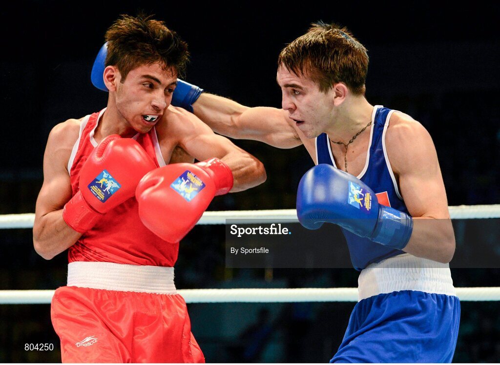 21 October 2013; Michael Conlan, right, St. John Bosco BC, Belfast, representing Ireland, exchanges punches with Brian Gonzalez, Mexico, during their Men's Bantamweight 56Kg Last 16 bout. AIBA World Boxing Championships Almaty 2013, Almaty, Kazakhstan. Photo by Sportsfile