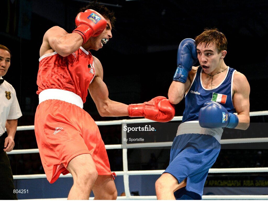 21 October 2013; Brian Gonzalez, left, Mexico, exchanges punches with Michael Conlan, St. John Bosco BC, Belfast, representing Ireland, during their Men's Bantamweight 56Kg Last 16 bout. AIBA World Boxing Championships Almaty 2013, Almaty, Kazakhstan. Photo by Sportsfile