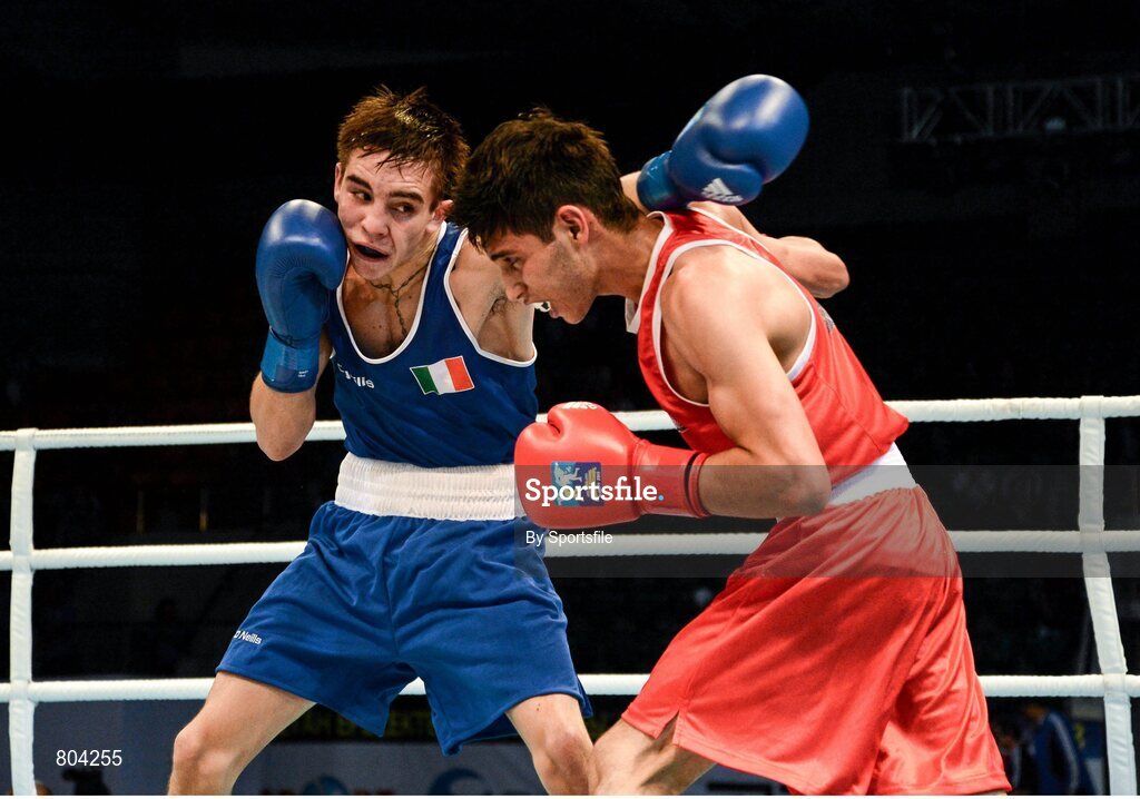 21 October 2013; Michael Conlan, left, St. John Bosco BC, Belfast, representing Ireland, exchanges punches with Brian Gonzalez, Mexico, during their Men's Bantamweight 56Kg Last 16 bout. AIBA World Boxing Championships Almaty 2013, Almaty, Kazakhstan. Photo by Sportsfile