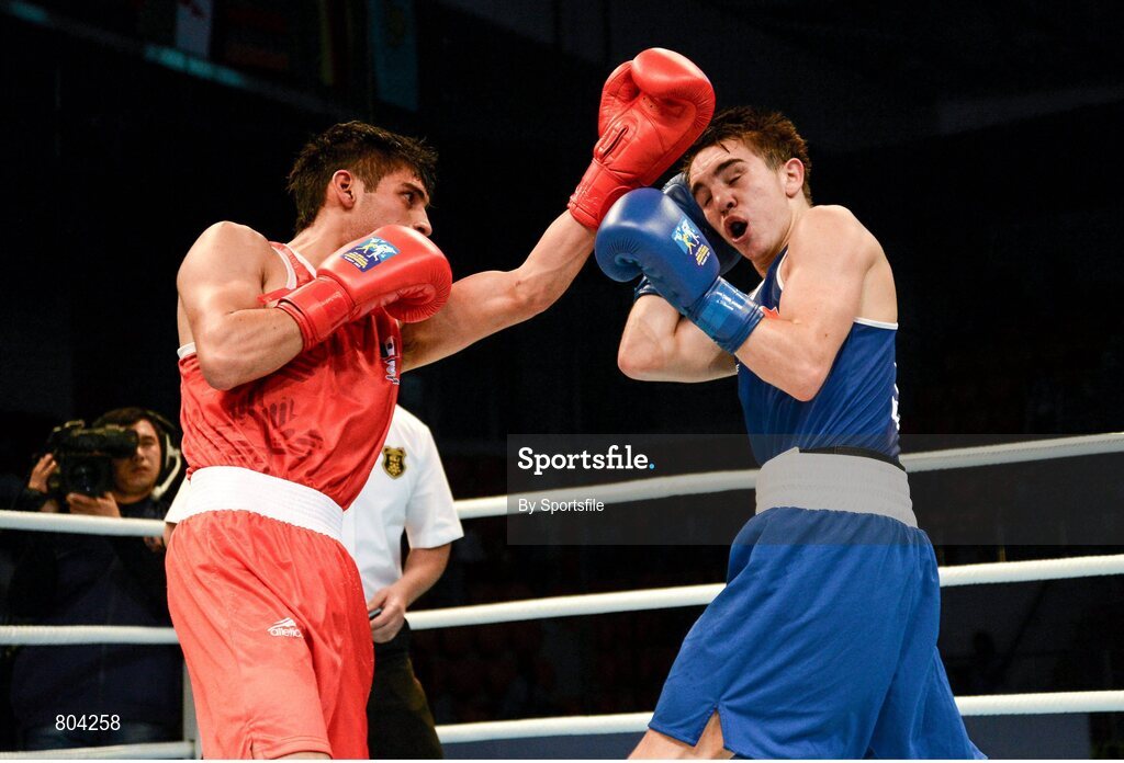 21 October 2013; Brian Gonzalez, left, Mexico, exchanges punches with Michael Conlan, St. John Bosco BC, Belfast, representing Ireland, during their Men's Bantamweight 56Kg Last 16 bout. AIBA World Boxing Championships Almaty 2013, Almaty, Kazakhstan. Photo by Sportsfile