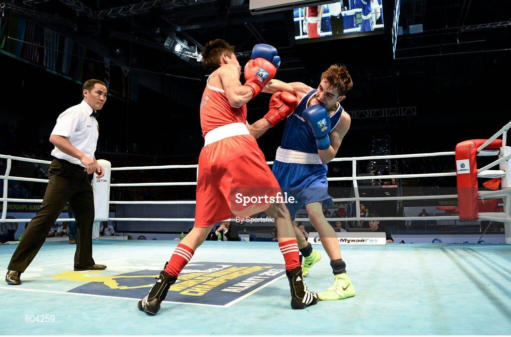 21 October 2013; Michael Conlan, right, St. John Bosco BC, Belfast, representing Ireland, exchanges punches with Brian Gonzalez, Mexico, during their Men's Bantamweight 56Kg Last 16 bout. AIBA World Boxing Championships Almaty 2013, Almaty, Kazakhstan. Photo by Sportsfile