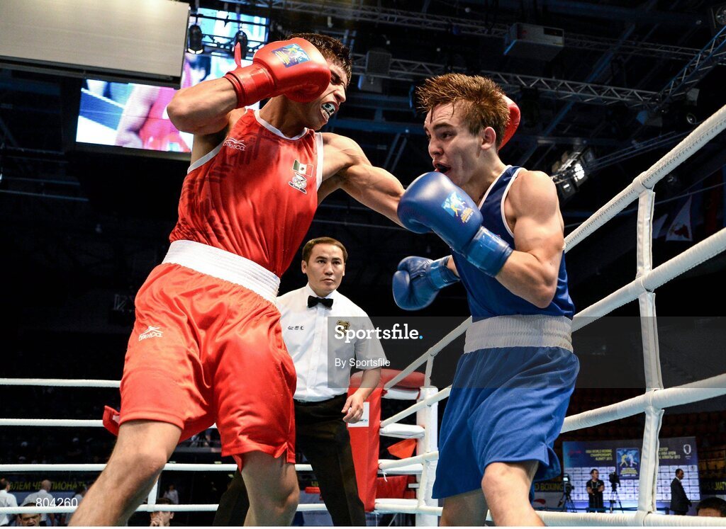 21 October 2013; Brian Gonzalez, left, Mexico, exchanges punches with Michael Conlan, St. John Bosco BC, Belfast, representing Ireland, during their Men's Bantamweight 56Kg Last 16 bout. AIBA World Boxing Championships Almaty 2013, Almaty, Kazakhstan. Photo by Sportsfile