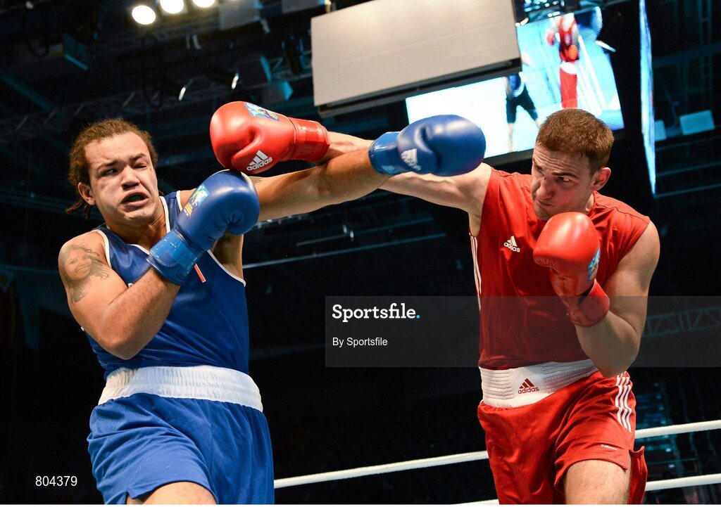 21 October 2013; Thomas McCarthy, left, Oliver Plunkett BC, Belfast, representing Ireland, exchanges punches with Emir Ahmatovic, Germany, during their Men's Heavyweight 91Kg Last 16 bout. AIBA World Boxing Championships Almaty 2013, Almaty, Kazakhstan. Photo by Sportsfile