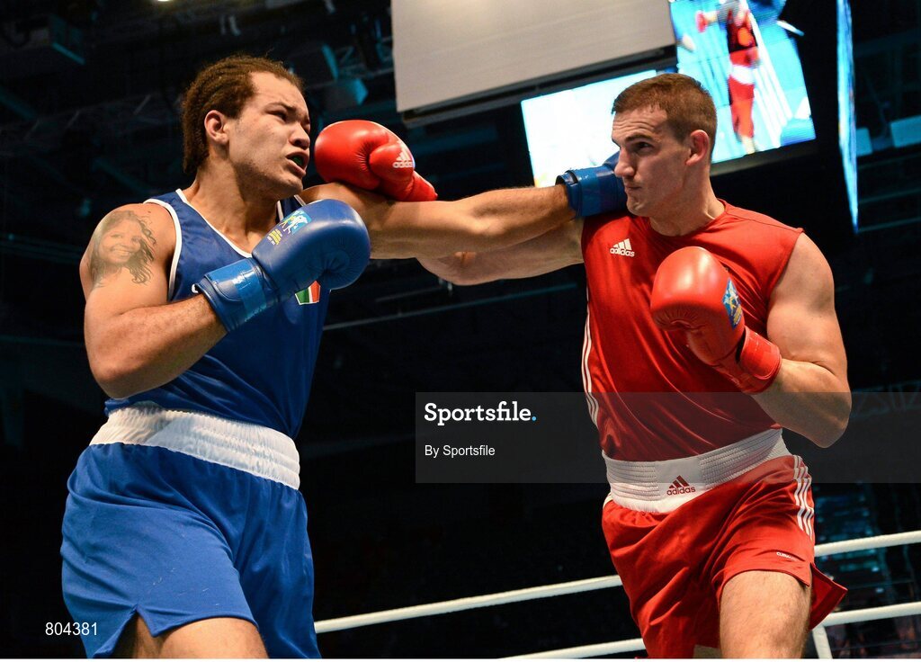 21 October 2013; Thomas McCarthy, left, Oliver Plunkett BC, Belfast, representing Ireland, exchanges punches with Emir Ahmatovic, Germany, during their Men's Heavyweight 91Kg Last 16 bout. AIBA World Boxing Championships Almaty 2013, Almaty, Kazakhstan. Photo by Sportsfile