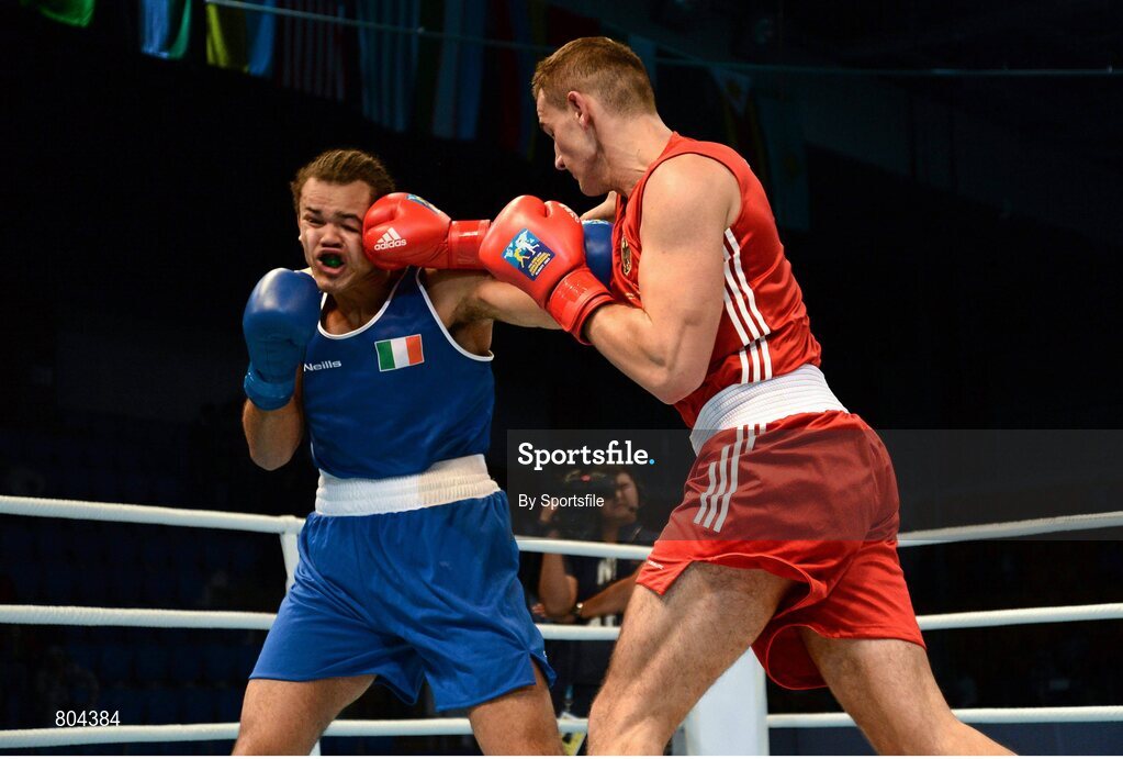 21 October 2013; Emir Ahmatovic, right, Germany, exchanges punches with Thomas McCarthy, Oliver Plunkett BC, Belfast, representing Ireland, during their Men's Heavyweight 91Kg Last 16 bout. AIBA World Boxing Championships Almaty 2013, Almaty, Kazakhstan. Photo by Sportsfile