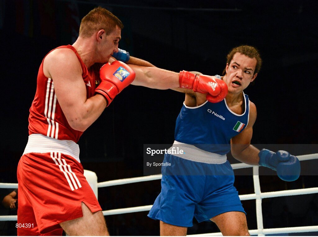 21 October 2013; Thomas McCarthy, right, Oliver Plunkett BC, Belfast, representing Ireland, exchanges punches with Emir Ahmatovic, Germany, during their Men's Heavyweight 91Kg Last 16 bout. AIBA World Boxing Championships Almaty 2013, Almaty, Kazakhstan. Photo by Sportsfile