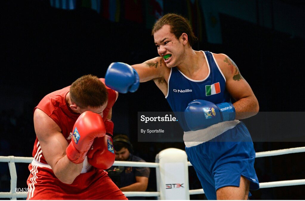 21 October 2013; Thomas McCarthy, right, Oliver Plunkett BC, Belfast, representing Ireland, exchanges punches with Emir Ahmatovic, Germany, during their Men's Heavyweight 91Kg Last 16 bout. AIBA World Boxing Championships Almaty 2013, Almaty, Kazakhstan. Photo by Sportsfile