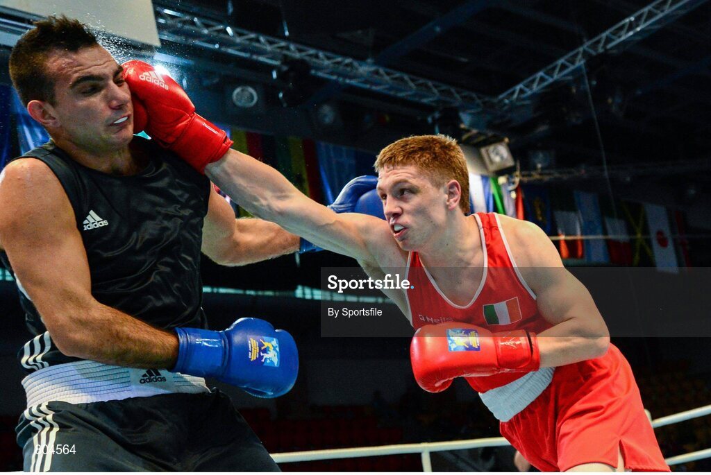 23 October 2013; Jason Quigley, right, Finn Valley BC, Donegal, representing Ireland, exchanges punches with Zoltan Harsca, Hungary, during their Men's Middleweight 75Kg Quarter-Final bout. AIBA World Boxing Championships Almaty 2013, Almaty, Kazakhstan. Photo by Sportsfile