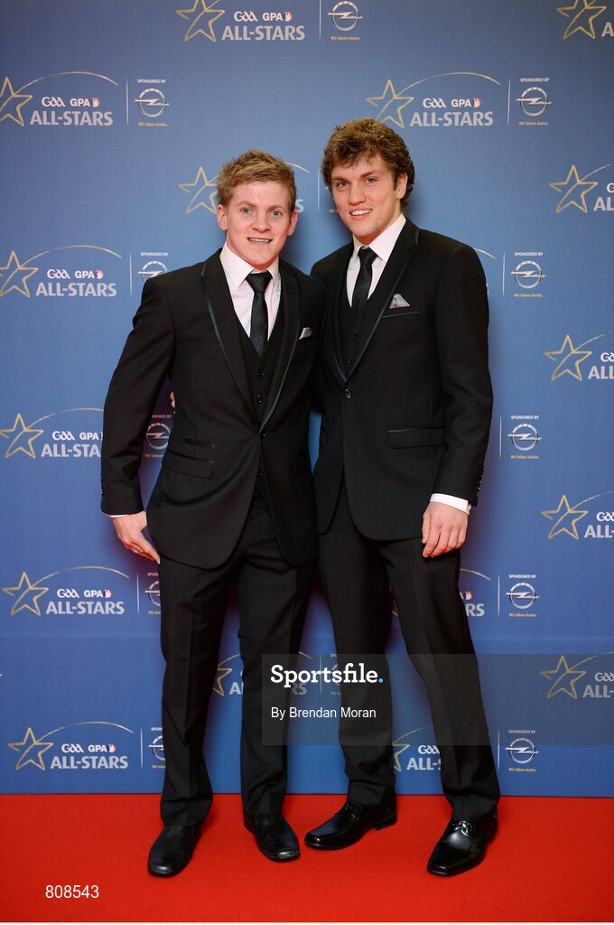 8 November 2013; Clare hurlers Pádraic Collins and Shane O'Donnell arrive ahead of the GAA GPA All-Star Awards 2013 Sponsored by Opel, at Croke Park, Dublin. Picture credit: Brendan Moran / SPORTSFILE