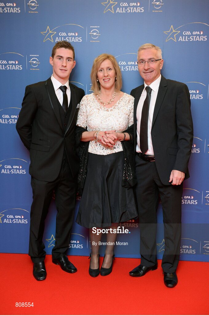 8 November 2013; Clare hurler Colm Galvin with his parents Geradline and Kevin arrive ahead of the GAA GPA All-Star Awards 2013 Sponsored by Opel, at Croke Park, Dublin. Picture credit: Brendan Moran / SPORTSFILE