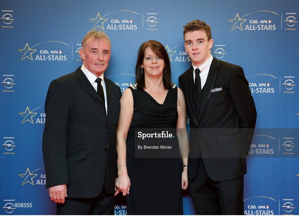 8 November 2013; Clare hurler Tony Kelly with his parents Moira and Donal arrive ahead of the GAA GPA All-Star Awards 2013 Sponsored by Opel, at Croke Park, Dublin. Picture credit: Brendan Moran / SPORTSFILE