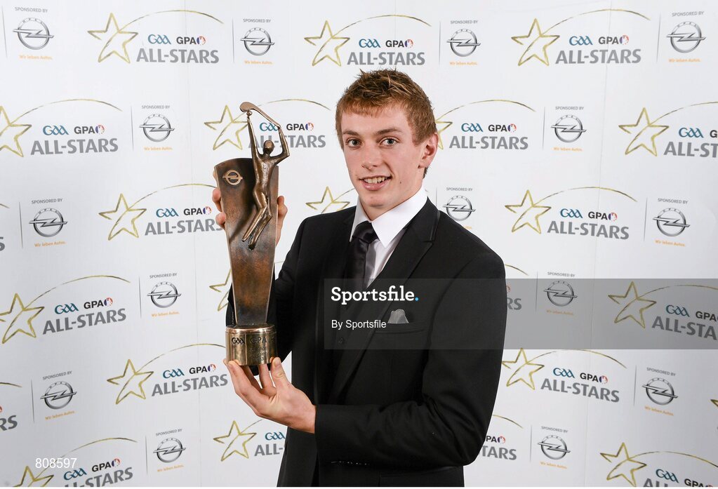 8 November 2013; Clare hurler David McInerney with his 2013 GAA GPA All-Star award, sponsored by Opel, at the 2013 GAA GPA All-Star awards in Croke Park, Dublin. Photo by Sportsfile