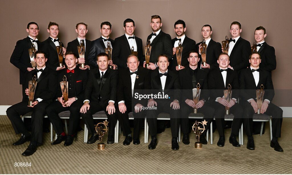 8 November 2013; The 2013 GAA GPA All-Star Football Team of the Year, sponsored by Opel, back row, from left, Stephen Cluxton, James O'Donoghue, Colm Cooper, Bernard Brogan, Sean Cavanagh, Aidan O'Shea, Cian O'Sullivan, Keith Higgins, Conor McManus and Colm Boyle, with front row, from left, Rory O'Carroll, Paul Flynn, Dessie Farrell, CEO of the GPA, Uachtarán Chumann Lúthchleas Gael Liam Ó Néill, Opel Ireland Managing Director Dave Sheeran, Michael Darragh Macauley, Colin Walshe and Lee Keegan at the 2013 GAA GPA All-Star awards in Croke Park, Dublin. Photo by Sportsfile