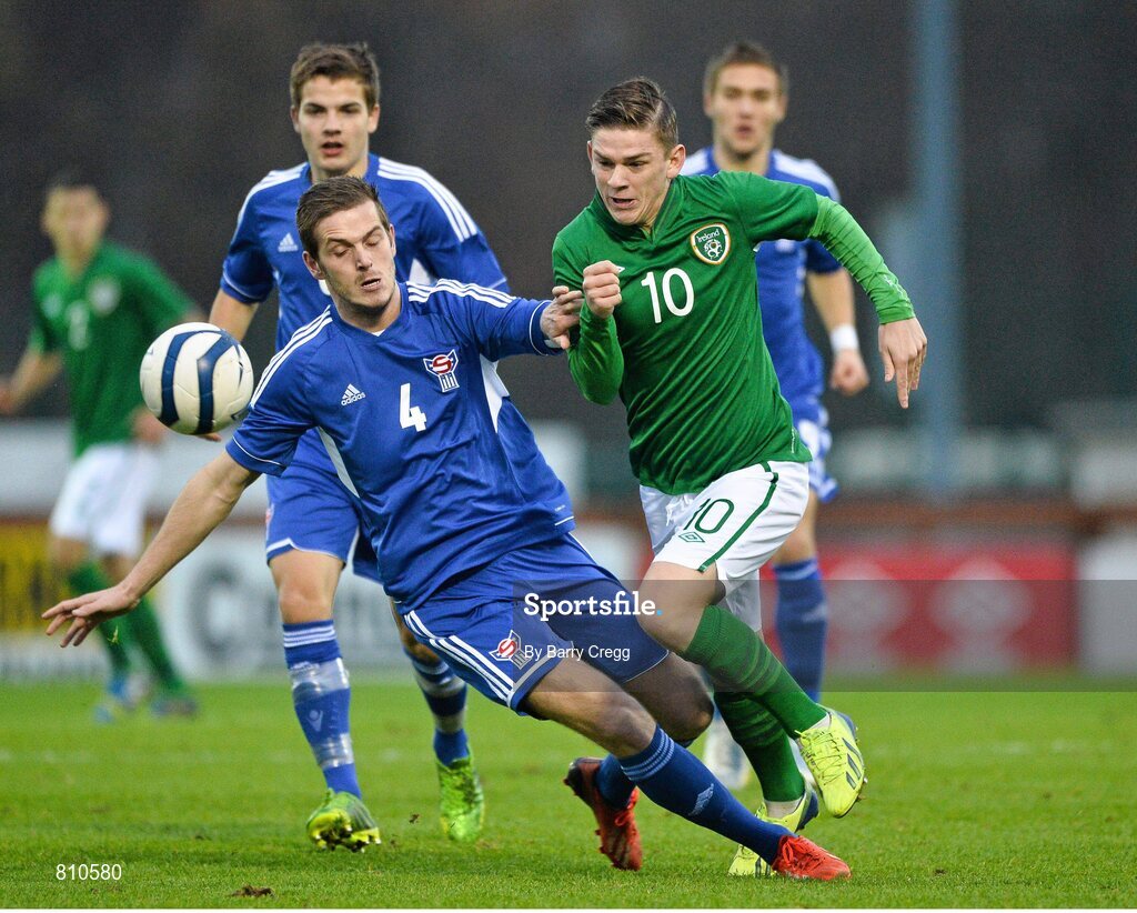15 November 2013; Seán Murray, Republic of Ireland, in action against Pál Joensen, Faroe Islands. UEFA U21 Qualifying Round, Group 6, Republic of Ireland v Faroe Islands, Showgrounds, Sligo. Picture credit: Barry Cregg / SPORTSFILE