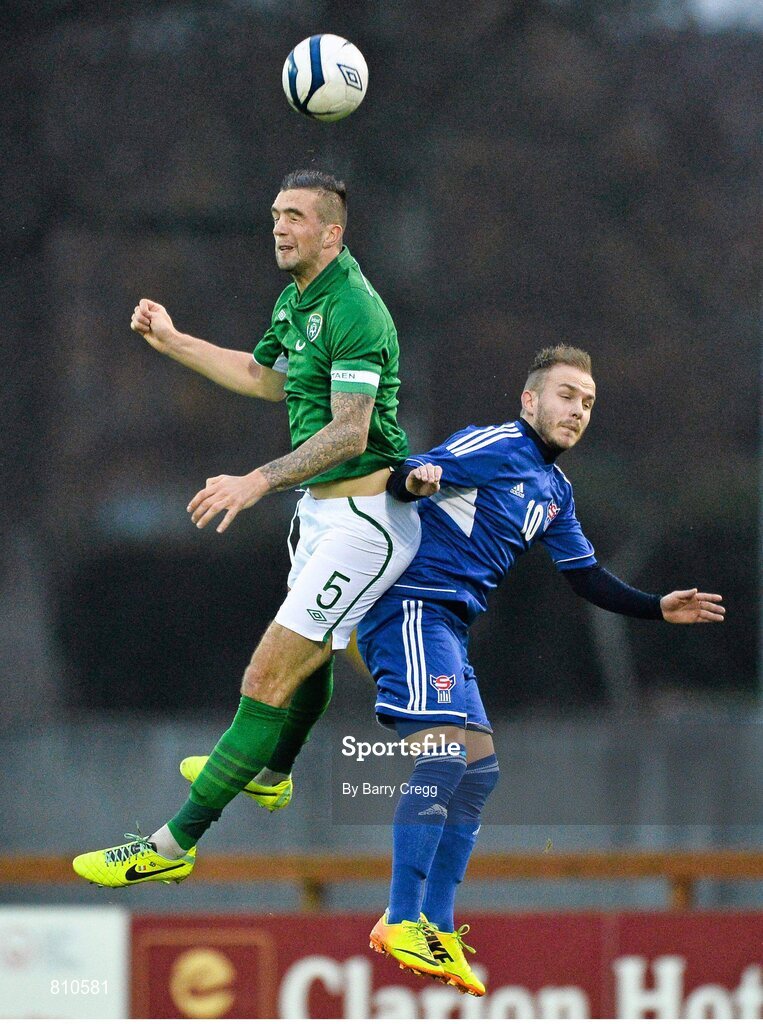 15 November 2013; Shane Duffy, Republic of Ireland, in action against Gunnar Zachariasen, Faroe Islands. UEFA U21 Qualifying Round, Group 6, Republic of Ireland v Faroe Islands, Showgrounds, Sligo. Picture credit: Barry Cregg / SPORTSFILE