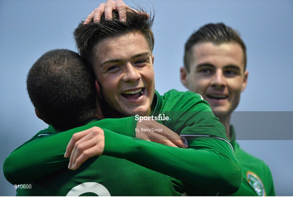 15 November 2013; Republic of Ireland's Jack Grealish, centre, celebrates with team-mates Samir Carruthers, left, and Anthony Forde after scoring his side's third goal of the game. UEFA U21 Qualifying Round, Group 6, Republic of Ireland v Faroe Islands, Showgrounds, Sligo. Picture credit: Barry Cregg / SPORTSFILE