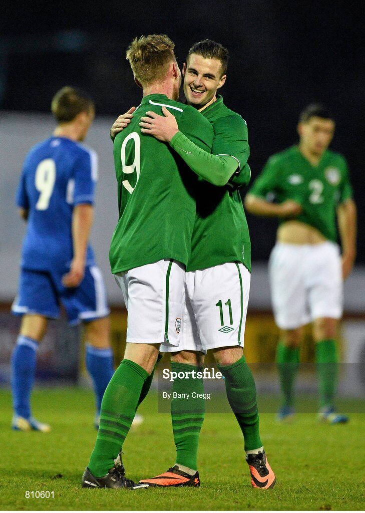 15 November 2013; Republic of Ireland's Anthony Forde, right, celebrates with team-mate Aiden O'Brien after scoring his side's fourth goal of the game. UEFA U21 Qualifying Round, Group 6, Republic of Ireland v Faroe Islands, Showgrounds, Sligo. Picture credit: Barry Cregg / SPORTSFILE