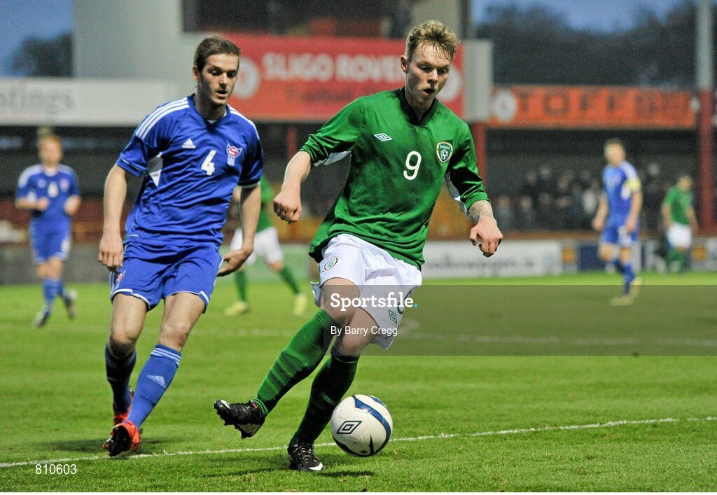 15 November 2013; Aiden O'Brien, Republic of Ireland, in action against Pál Joensen, Faroe Islands. UEFA U21 Qualifying Round, Group 6, Republic of Ireland v Faroe Islands, Showgrounds, Sligo. Picture credit: Barry Cregg / SPORTSFILE