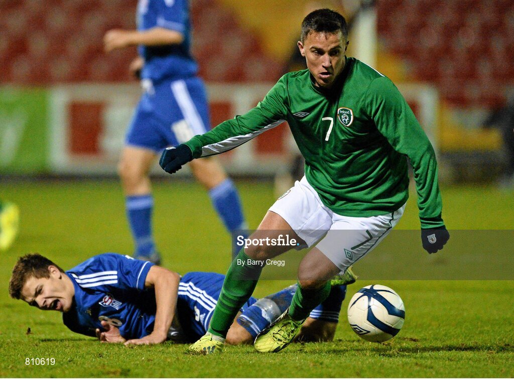 15 November 2013; John O'Sullivan, Republic of Ireland, in action against Brandur Olsen, Faroe Islands. UEFA U21 Qualifying Round, Group 6, Republic of Ireland v Faroe Islands, Showgrounds, Sligo. Picture credit: Barry Cregg / SPORTSFILE