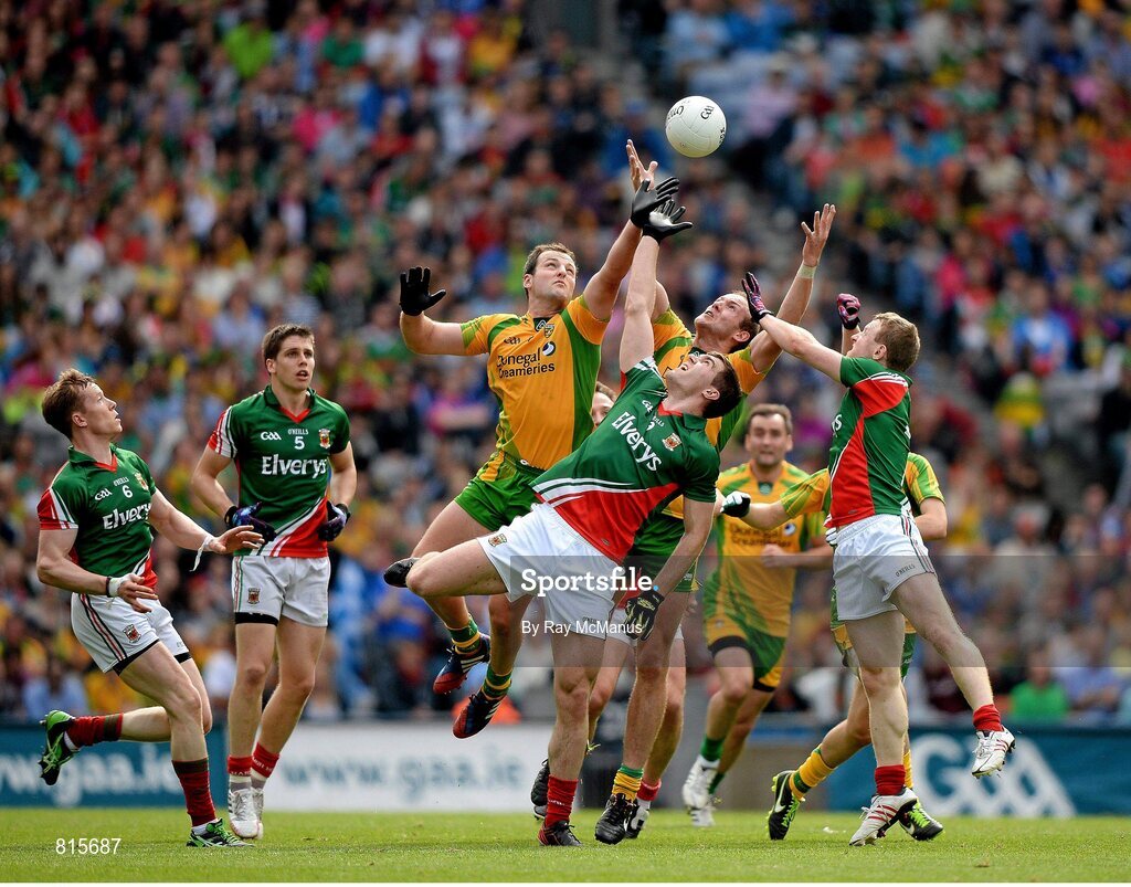 4 August 2013; Referee Joe McQuillan keeps a close eye as Donegal players Michael Murphy and Neil Gallagher are outnumbered by Mayo's Donal Vaughan, 6, Lee Keegan, 5, Séamus O'Shea and Colm Boyle during the second half. GAA Football All-Ireland Senior Championship, Quarter-Final, Mayo v Donegal, Croke Park, Dublin. Picture credit: Ray McManus / SPORTSFILE