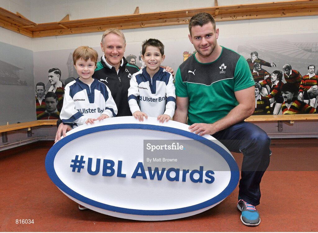 5 December 2013; Ireland head coach Joe Schmidt and Irish rugby player Fergus McFadden were joined today by six year old Brendan Mullins and nine year old Mark Casey at Lansdowne FC to announce the return of the Ulster Bank League Awards. Ulster Bank, Official Community Rugby Partner to the IRFU, first introduced the awards last season to recognise and reward the dedication and commitment shown by players, coaches and teams, across all Ulster Bank League Divisions. Lansdowne RFC, Lansdowne Road, Dublin. Picture credit: Matt Browne / SPORTSFILE