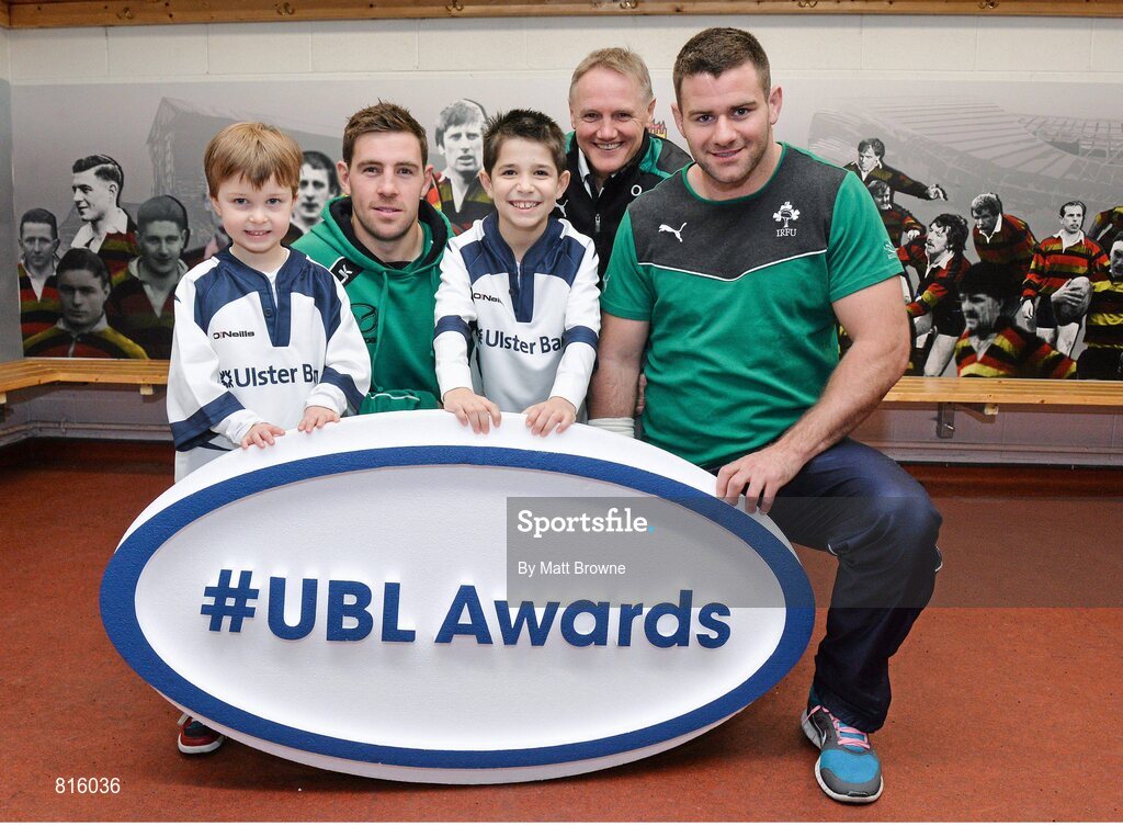 5 December 2013; Ireland head coach Joe Schmidt with rising Connacht star Craig Ronaldson right and Irish rugby player Fergus McFadden, who were joined by six year old Brendan Mullins and nine year old Mark Casey at Lansdowne FC to announce the return of the Ulster Bank League Awards. Ulster Bank, the Official Community Rugby Partner to the IRFU, first introduced the awards last season to recognise and reward the dedication and commitment shown by players, coaches and teams, across all Ulster Bank League Divisions. Lansdowne RFC, Lansdowne Road, Dublin. Picture credit: Matt Browne / SPORTSFILE