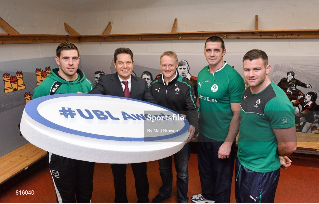 5 December 2013; Ireland head coach Joe Schmidt, with from left rising Connacht star Craig Ronaldson, Jim Ryan from Ulster Bank, Alan Quinlan, Ulster Bank rugby ambassador and Irish rugby players Fergus McFadden at Lansdowne FC to announce the return of the Ulster Bank League Awards. Ulster Bank, Official Community Rugby Partner to the IRFU, first introduced the awards last season to recognise and reward the dedication and commitment shown by players, coaches and teams, across all Ulster Bank League Divisions. Lansdowne RFC, Lansdowne Road, Dublin. Picture credit: Matt Browne / SPORTSFILE