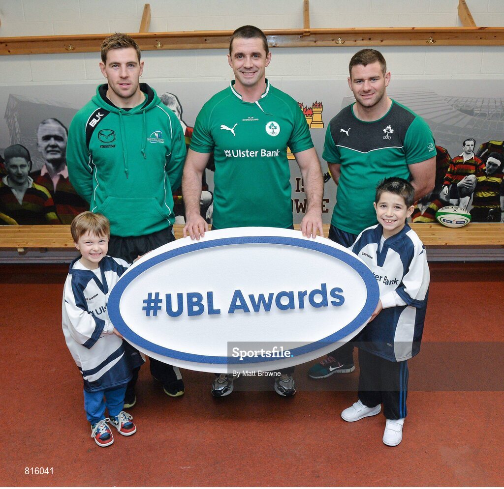 5 December 2013; Ulster Bank rugby ambassador Alan Quinlan, centre, with rising Connacht star Craig Ronaldson, left, and Irish rugby players Fergus McFadden who were joined by six year old Brendan Mullins and nine year old Mark Casey at Lansdowne FC to announce the return of the Ulster Bank League Awards. Ulster Bank, Official Community Rugby Partner to the IRFU, first introduced the awards last season to recognise and reward the dedication and commitment shown by players, coaches and teams, across all Ulster Bank League Divisions. Lansdowne RFC, Lansdowne Road, Dublin. Picture credit: Matt Browne / SPORTSFILE