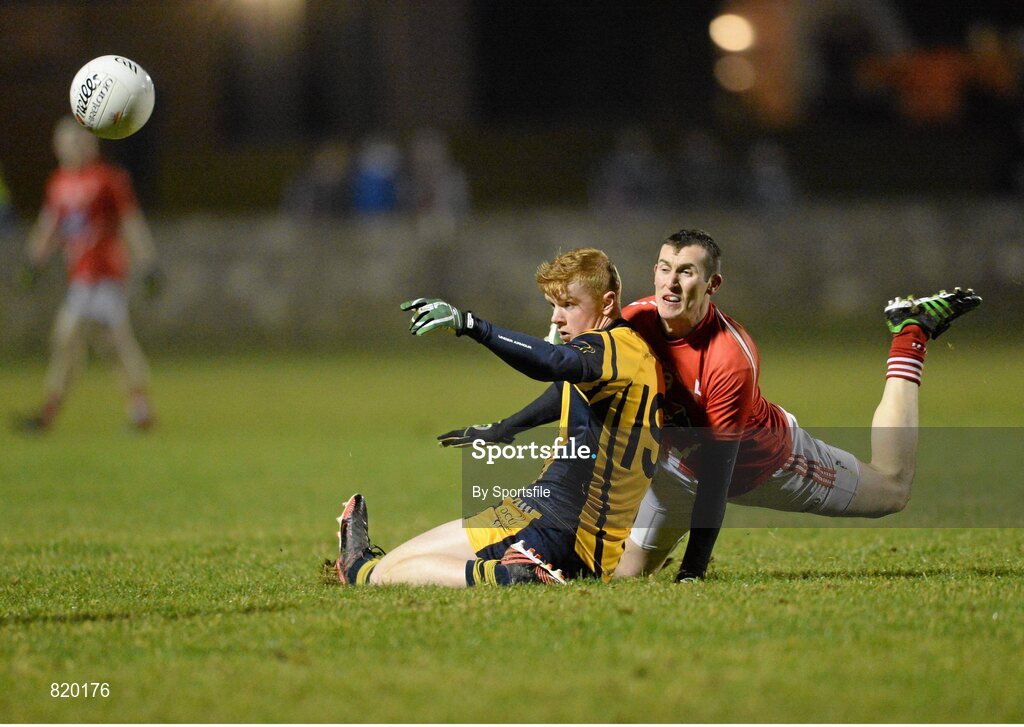 4 January 2014; Kieran Ward, DCU, in action against Dessie Finnegan, Louth. Bord na Mona O'Byrne Cup, Group D, Round 1, Louth v DCU, Páirc Séamus Mhic hEochaidh, Haggardstown, Co Louth. Photo by Sportsfile