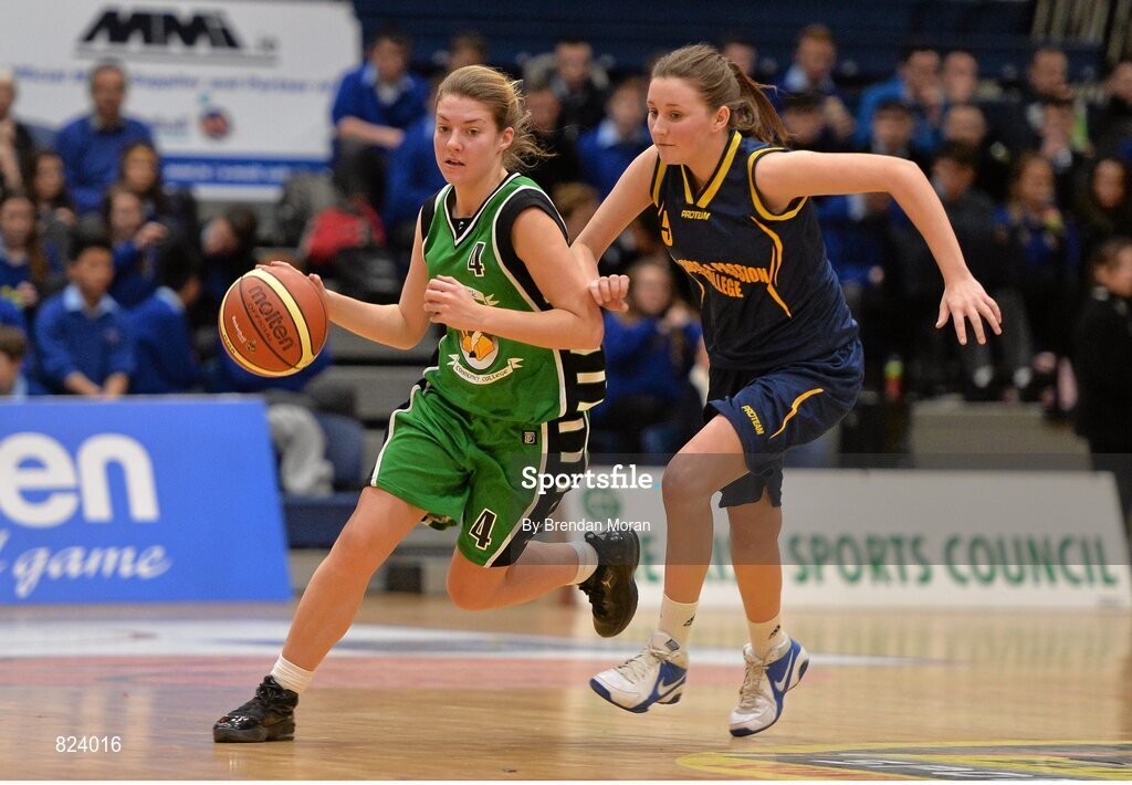 21 January 2014; Laura Carolan, Castleknock Community College, in action against Katie Willis, Cross & Passion Kilcullen. All-Ireland Schools Cup U19B Girls Final, Cross & Passion, Kilcullen, Co. Kildare v Castleknock Community College, Dublin, National Basketball Arena, Tallaght, Co. Dublin. Picture credit: Brendan Moran / SPORTSFILE