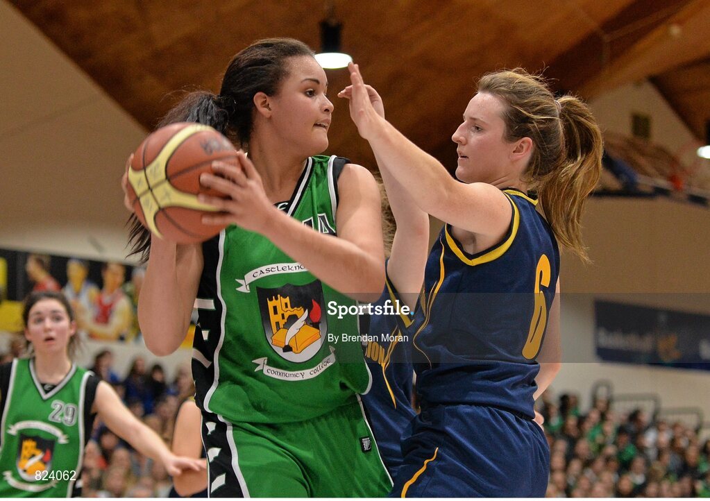 21 January 2014; Whitney Moia of Castleknock Community College in action against Daire Smyth of Cross & Passion Kilcullen during the All-Ireland Schools Cup U19B Girls Final match between Cross & Passion Kilcullen and Castleknock Community College Dublin at the National Basketball Arena in Tallaght, Co Dublin. Photo by Brendan Moran/Sportsfile