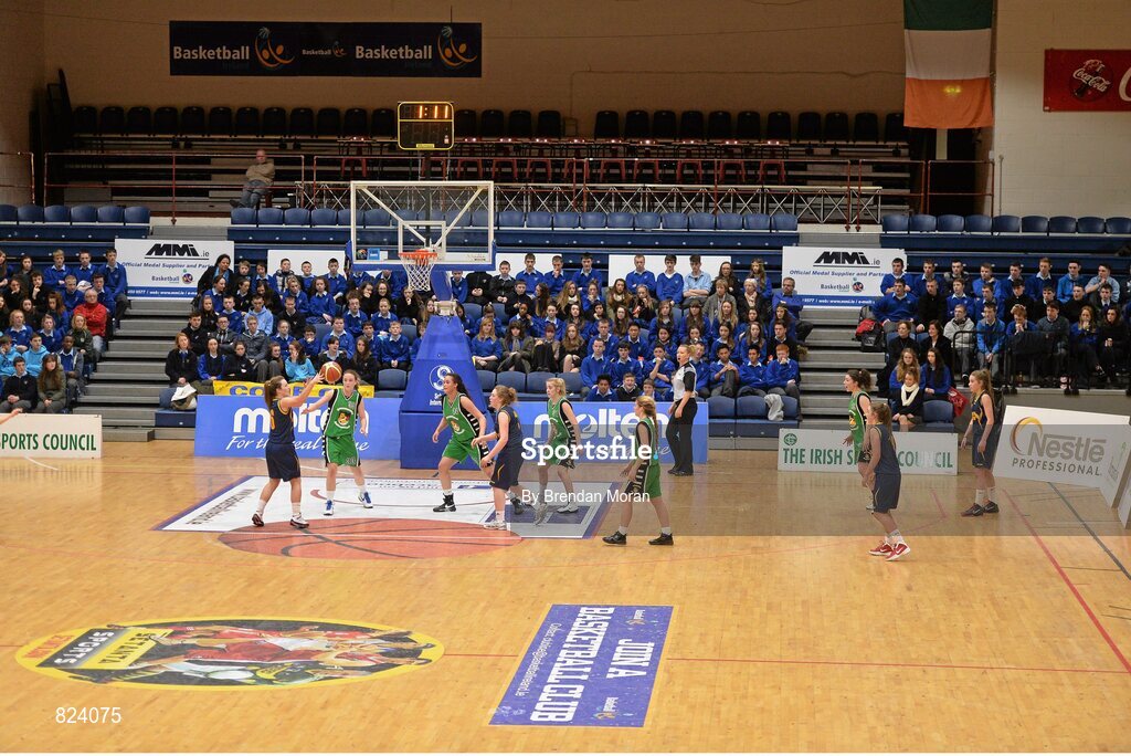21 January 2014; A general view of the action between Castleknock Community College and Cross & Passion Kilcullen. All-Ireland Schools Cup U19B Girls Final, Cross & Passion, Kilcullen, Co. Kildare v Castleknock Community College, Dublin, National Basketball Arena, Tallaght, Co. Dublin. Picture credit: Brendan Moran / SPORTSFILE