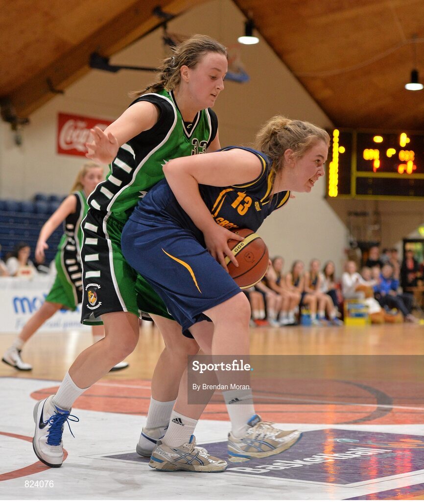 21 January 2014; Carrie Lidierth, Cross & Passion Kilcullen, in action against Lauren O'Neill, Castleknock Community College. All-Ireland Schools Cup U19B Girls Final, Cross & Passion, Kilcullen, Co. Kildare v Castleknock Community College, Dublin, National Basketball Arena, Tallaght, Co. Dublin. Picture credit: Brendan Moran / SPORTSFILE