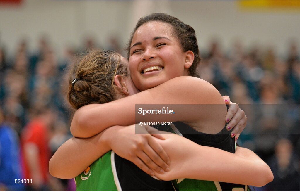 21 January 2014; Castleknock Community College team-mates Whitney Moia, right, and Lauren O'Neill celebrate their victory over Cross & Passion Kilcullen. All-Ireland Schools Cup U19B Girls Final, Cross & Passion, Kilcullen, Co. Kildare v Castleknock Community College, Dublin, National Basketball Arena, Tallaght, Co. Dublin. Picture credit: Brendan Moran / SPORTSFILE
