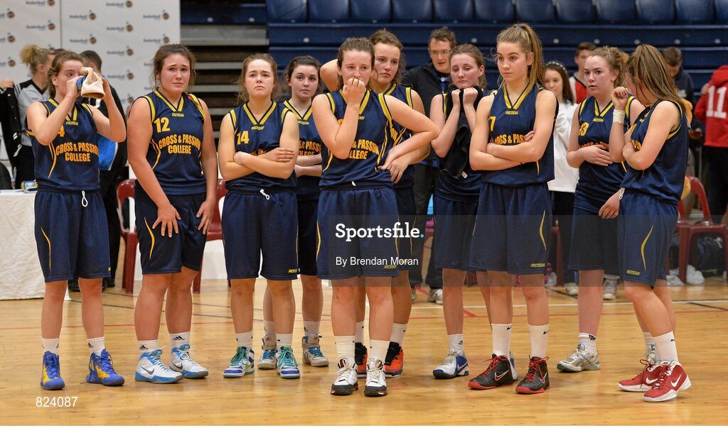 21 January 2014; Dejected Cross & Passion Kilcullen players after the game. All-Ireland Schools Cup U19B Girls Final, Cross & Passion, Kilcullen, Co. Kildare v Castleknock Community College, Dublin, National Basketball Arena, Tallaght, Co. Dublin. Picture credit: Brendan Moran / SPORTSFILE