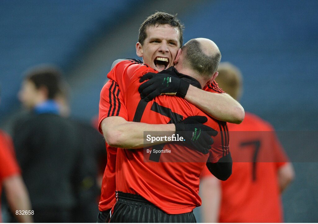 9 February 2014; Barry Cuddy, left, Truagh, celebrates with team-mate Mark Counihan at the end of the game. AIB GAA Football All Ireland Intermediate Club Championship Final, Kiltane, Mayo v Truagh, Monaghan. Croke Park, Dublin. Photo by Sportsfile