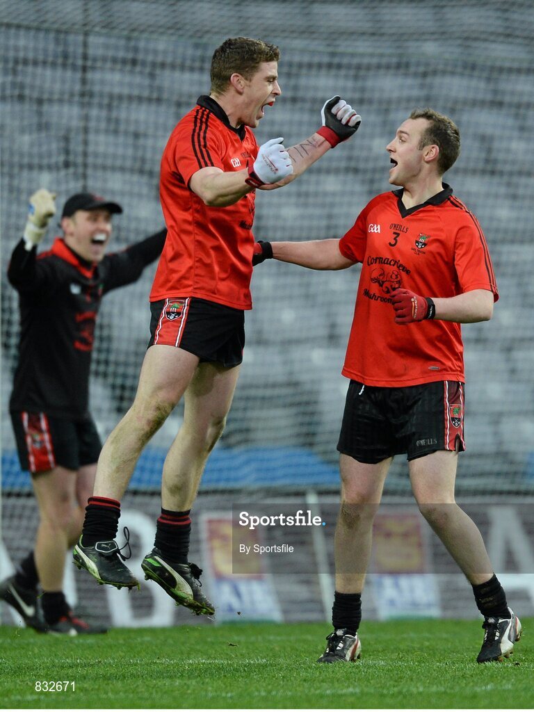 9 February 2014; Niall McQuillan, left, and Niall Feely, Truagh, celebrate at the final whistle. AIB GAA Football All Ireland Intermediate Club Championship Final, Kiltane, Mayo v Truagh, Monaghan. Croke Park, Dublin. Photo by Sportsfile