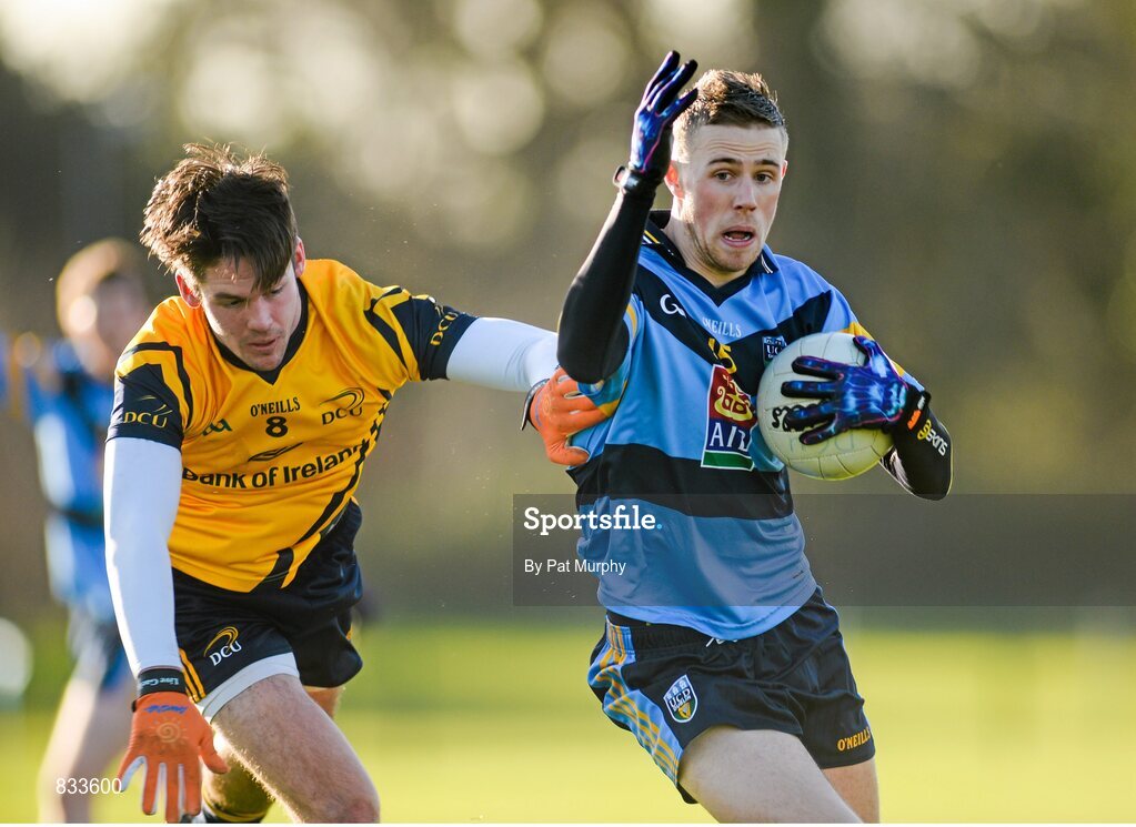 13 February 2014; Paul Mannion, University College Dublin, in action against Eoin O'Connor, Dublin City University. Irish Daily Mail HE GAA Sigerson Cup 2014, Quarter-Final, University College Dublin v Dublin City University, UCD, Belfield, Dublin. Picture credit: Pat Murphy / SPORTSFILE