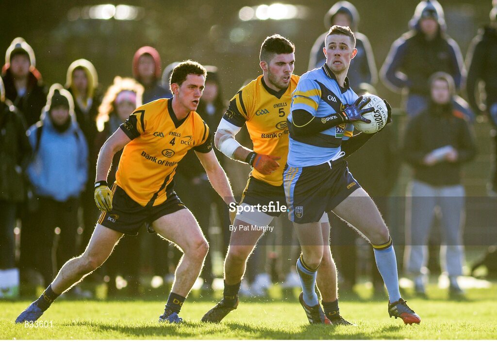 13 February 2014; Paul Mannion, University College Dublin, in action against Ciaran Cafferty, left, and Pete Dooney, Dublin City University. Irish Daily Mail HE GAA Sigerson Cup 2014, Quarter-Final, University College Dublin v Dublin City University, UCD, Belfield, Dublin. Picture credit: Pat Murphy / SPORTSFILE