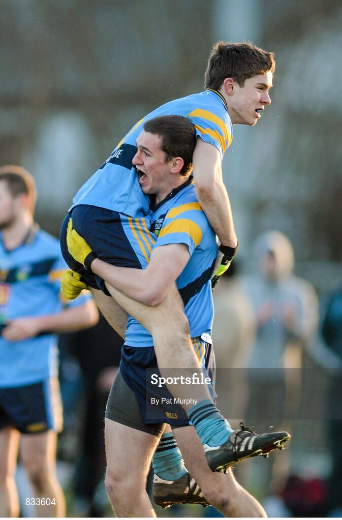 13 February 2014; University College Dublin's David Byrne is held aloft by team-mate Shane McEntee as they celebrate at the final whistle. Irish Daily Mail HE GAA Sigerson Cup 2014, Quarter-Final, University College Dublin v Dublin City University, UCD, Belfield, Dublin. Picture credit: Pat Murphy / SPORTSFILE