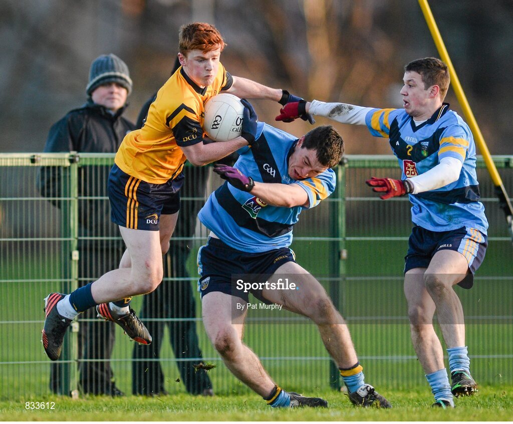 13 February 2014; Conor McHugh, Dublin City University, in action against Paraic O'Harnan, left, and Ryan Wylie, University College Dublin. Irish Daily Mail HE GAA Sigerson Cup 2014, Quarter-Final, University College Dublin v Dublin City University, UCD, Belfield, Dublin. Picture credit: Pat Murphy / SPORTSFILE