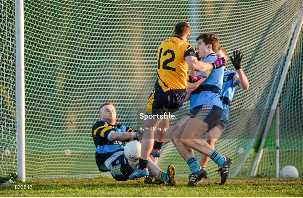 13 February 2014; Davy Byrne, Dublin City University, has his shot saved by Eoghan Keogh, University College Dublin, during the final minutes of the game. Irish Daily Mail HE GAA Sigerson Cup 2014, Quarter-Final, University College Dublin v Dublin City University, UCD, Belfield, Dublin. Picture credit: Pat Murphy / SPORTSFILE