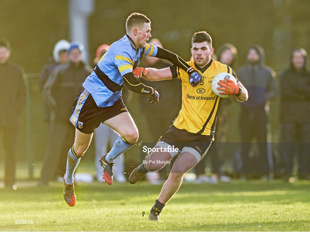 13 February 2014; Pete Dooney, Dublin City University, in action against Paul Mannion, University College Dublin. Irish Daily Mail HE GAA Sigerson Cup 2014, Quarter-Final, University College Dublin v Dublin City University, UCD, Belfield, Dublin. Picture credit: Pat Murphy / SPORTSFILE