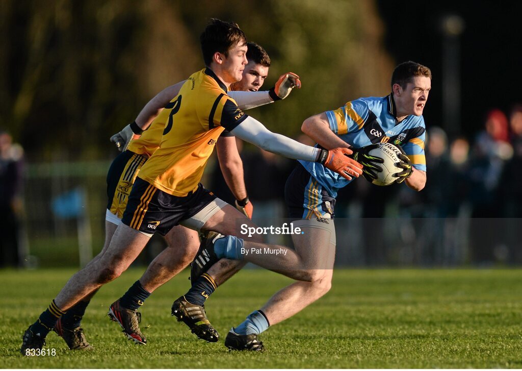 13 February 2014; Brian Fenton, University College Dublin, in action against Pete Dooney, partially hidden, and Eoin O'Connor, Dublin City University. Irish Daily Mail HE GAA Sigerson Cup 2014, Quarter-Final, University College Dublin v Dublin City University, UCD, Belfield, Dublin. Picture credit: Pat Murphy / SPORTSFILE